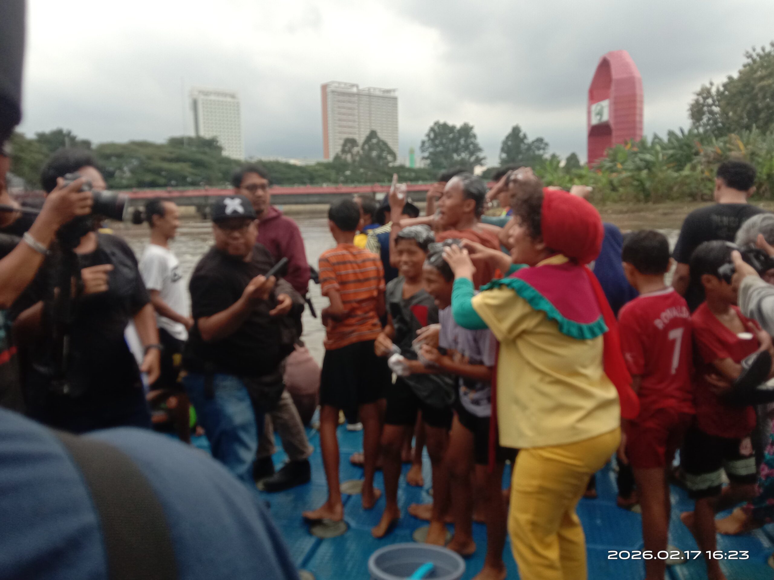 Masyarakat dari berbagai usia, mulai dari balita hingga orang dewasa, berkumpul di bantaran Sungai Cisadane Penuh semangat dan riang